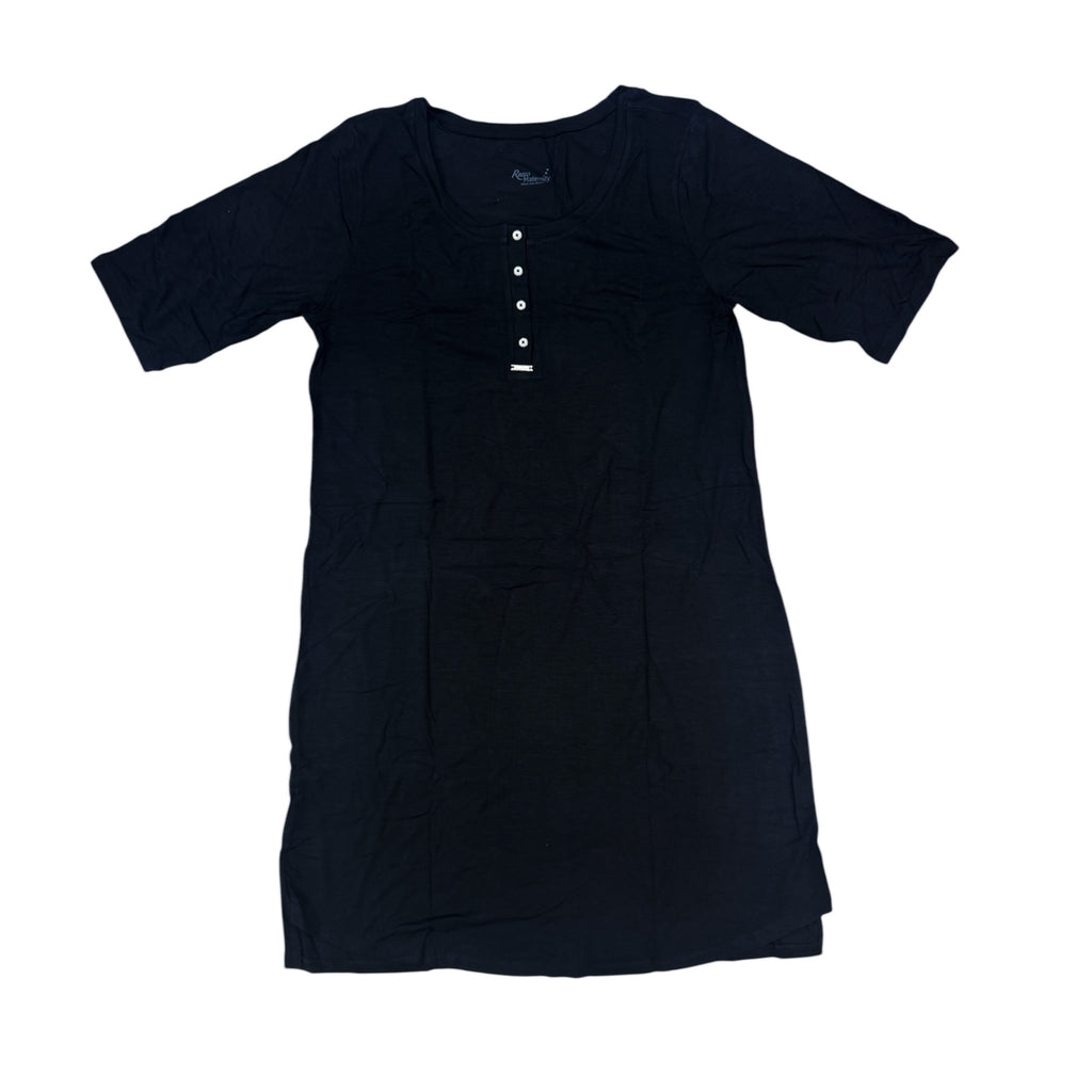 This is a maternity nightgown designed for comfort and practicality. It features a round neckline and short sleeves, offering a relaxed fit. The buttoned front allows for easy nursing access, making it ideal for both...