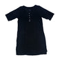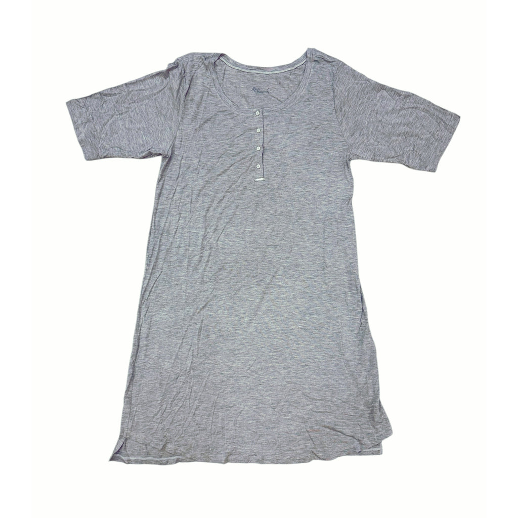 This is a maternity nightgown designed for comfort and practicality. It features a round neckline and short sleeves, offering a relaxed fit. The buttoned front allows for easy nursing access, making it ideal for both pregnancy and postpartum wear. Made from soft and breathable fabric, it provides a cozy feel for restful nights.