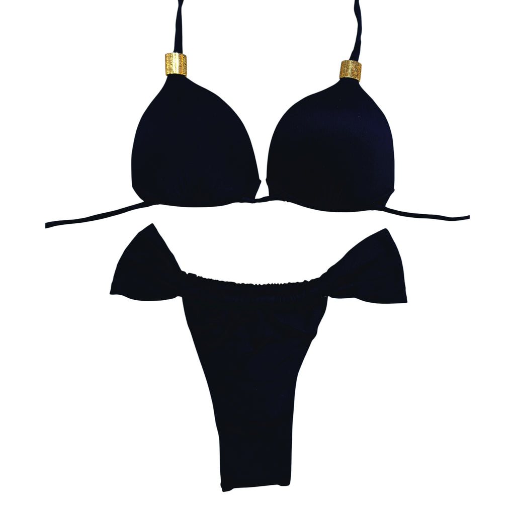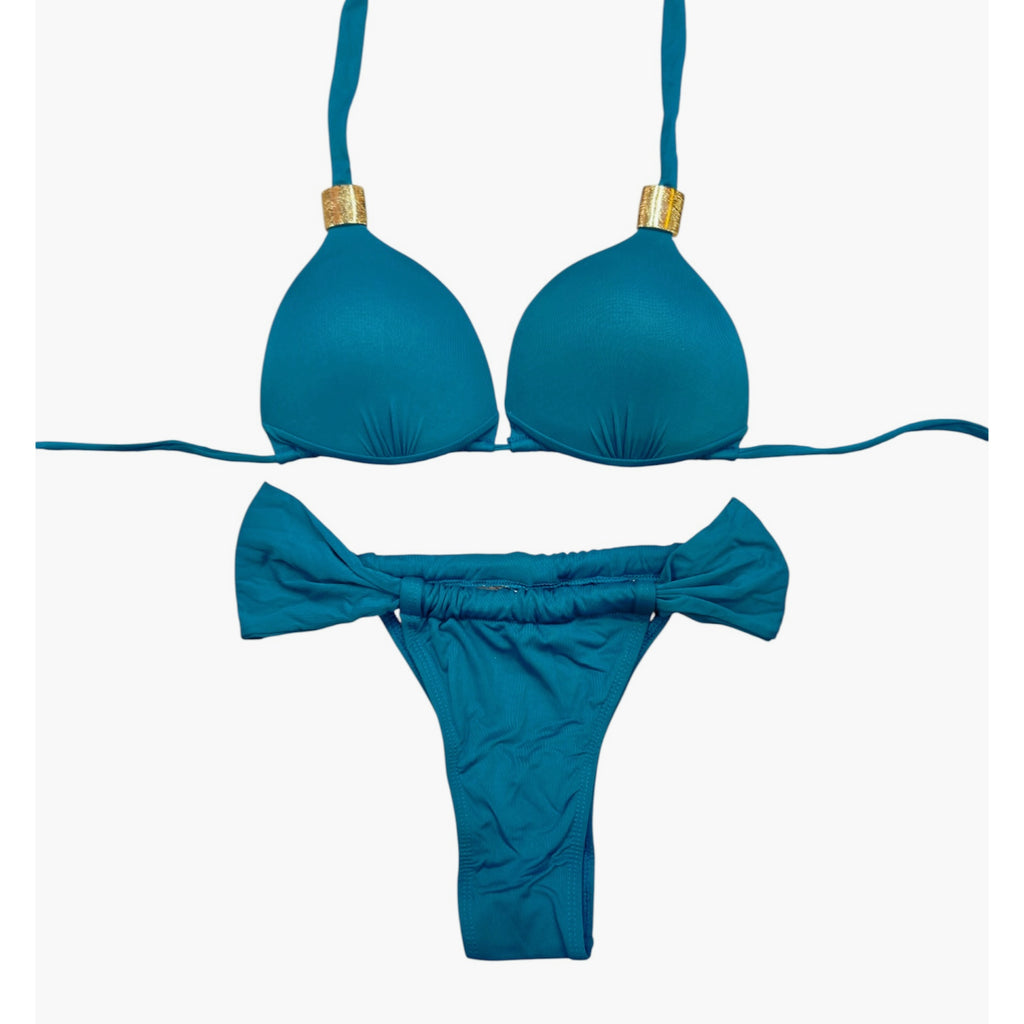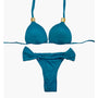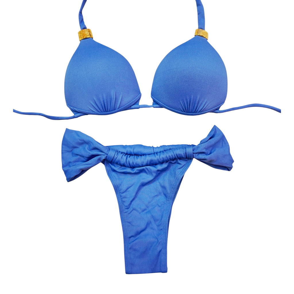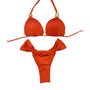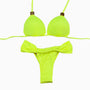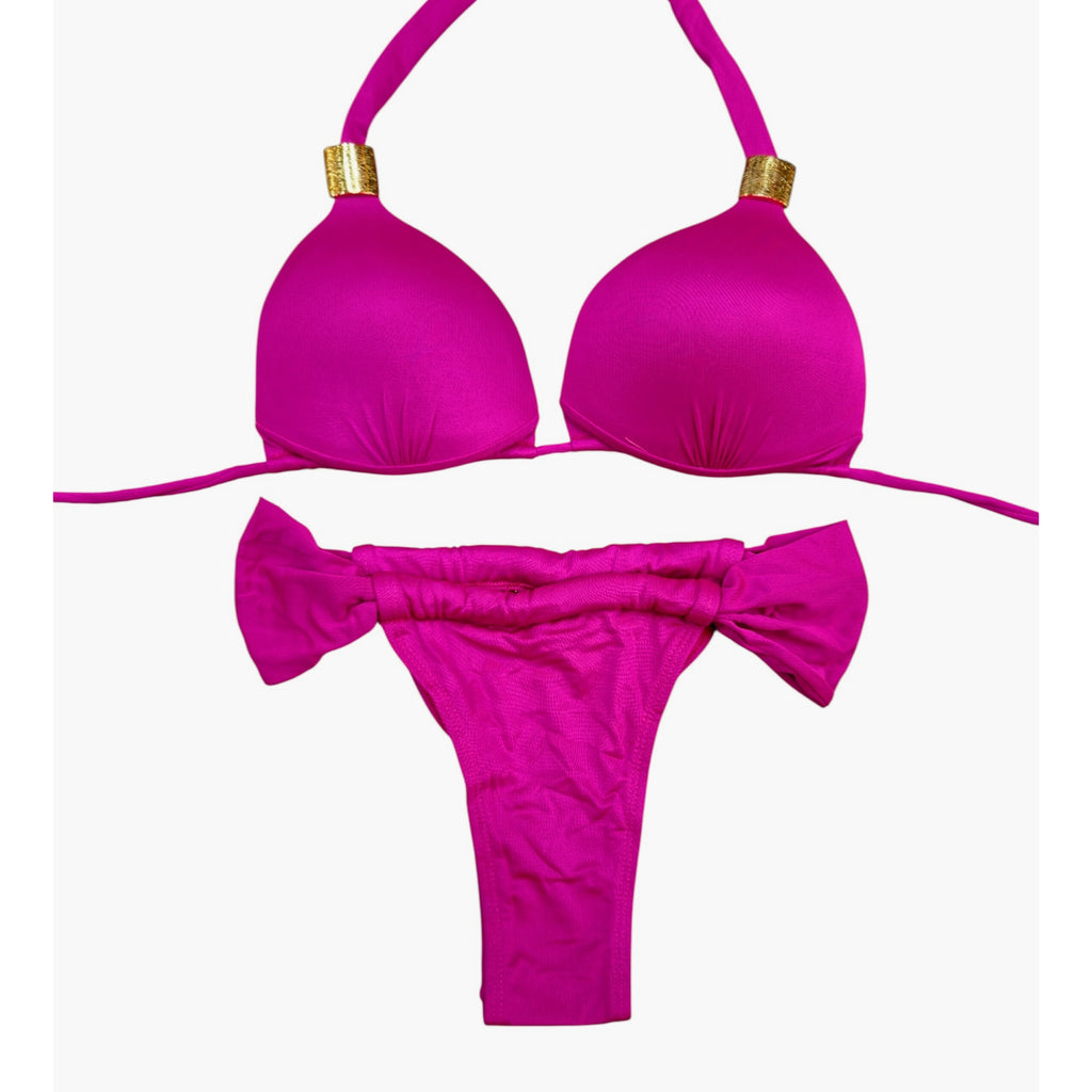 This vibrant bikini set features a classic triangle top with fixed padding for a structured and flattering fit. The halter-style top ties at the neck and back for adjustable support and comfort. The bottom is a ruched curtain-style design, both in the front and back, offering a cheeky silhouette with side tie details that enhance the overall playful and bold look. Perfect for making a statement poolside or at the beach.