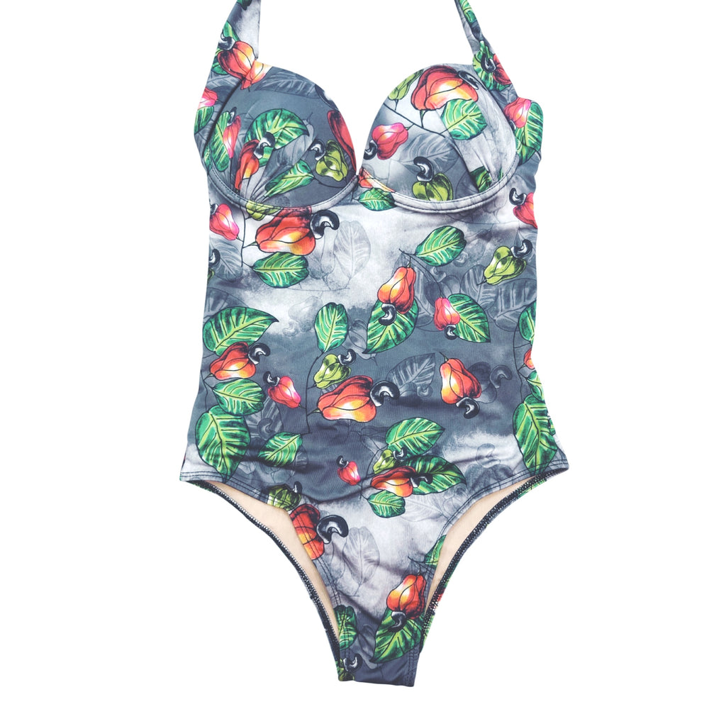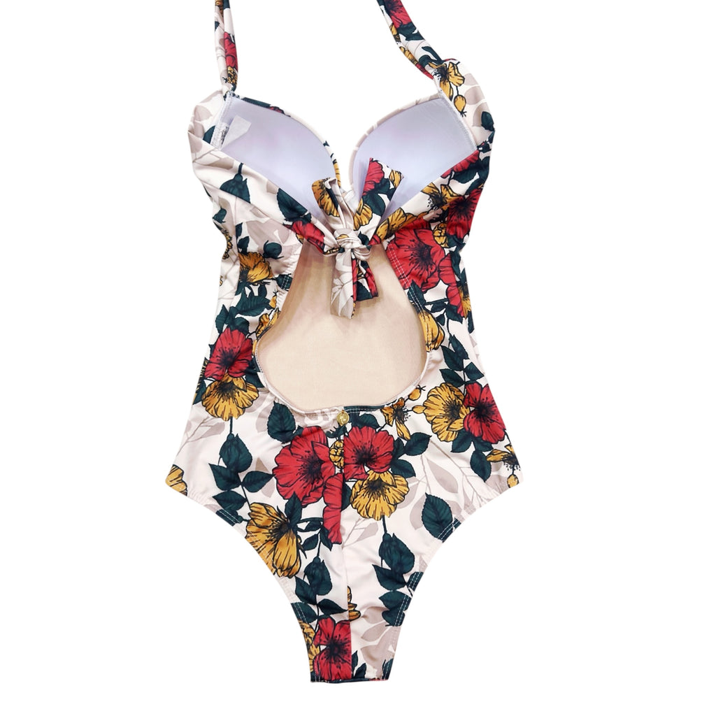 Flaunt a feminine and elegant look with this floral one-piece swimsuit, featuring structured underwire cups with non-removable padding for enhanced support and shape. The halter neckline and tie-back detail add a playful yet secure touch, while the open-back cutout brings a modern flair to a classic silhouette. Designed to combine comfort and style, this piece is perfect for making a statement at the beach or poolside.