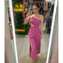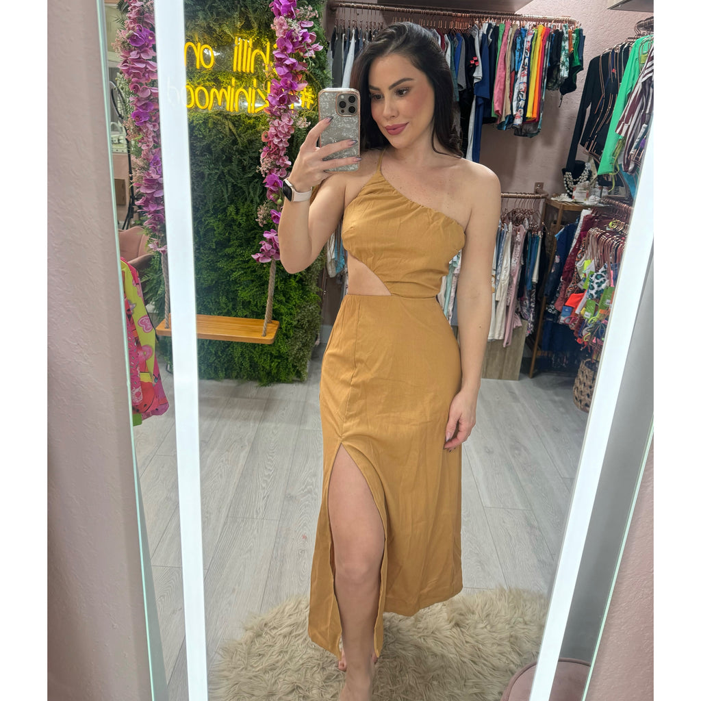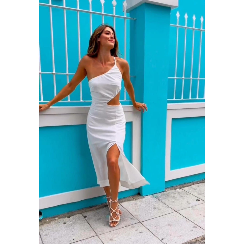 With one strap front, adjustable strap on the back, a front slit along the leg, and a cutout at the waist.