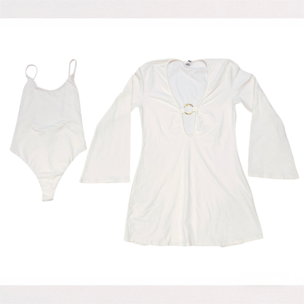 A versatile beach-to-dinner duo with elevated details. This two-piece set combines a textured one-piece swimsuit with a matching slip-on dress featuring a decorative ring detail at the neckline. Effortless, flattering and made for sunny days.